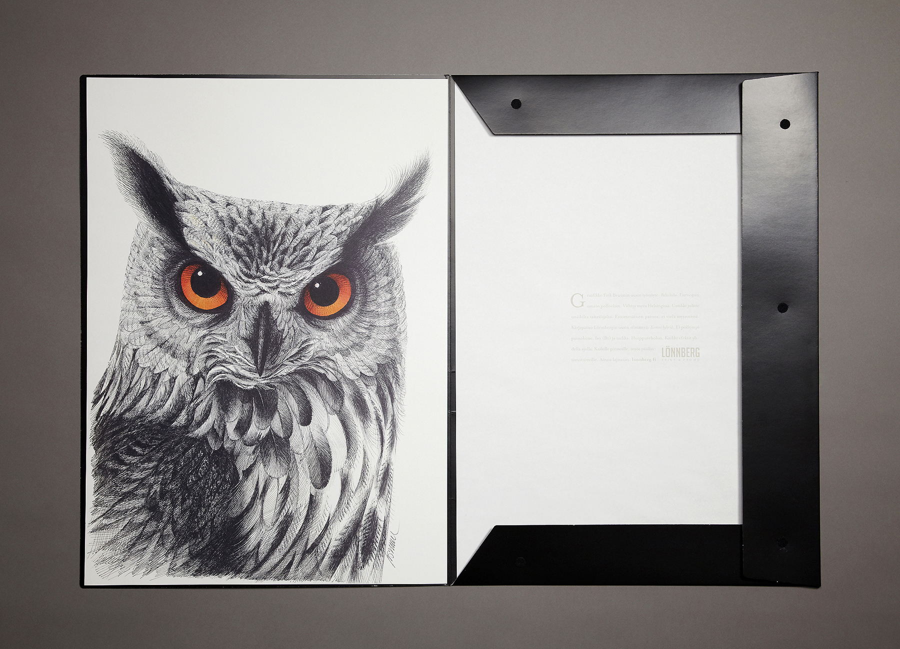 Norppa- ja Jaffajulisteistaan aikoinaan kuuluisaksi tullut Erik Bruun piirsi kirjapaino Lönnbergin asiakaslahjaan hienon huuhkajan. Julisteen koko oli 50×70.