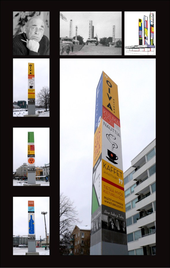 Alvar Aallon aikoinaan suunnittelemat kolmisivuiset pylonit rakennettiin uudestaan ja otettiin mainoskäyttöön Turun kulttuuripääkaupunkivuoden aikana. Oli ilo suunnitella niihin tyyliin sopivat mainokset mm. Finnairille ja Hartwallille. Oivalliset tekstit muotoili Pasi Janhunen.