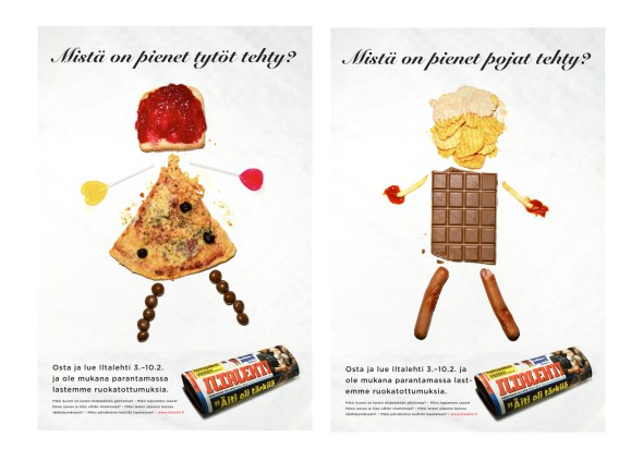 Hätkähdyttävät hahmot katukuvassa -pizzatyttö ja suklaapoika. Kannanottomme lasten epäterveellisiä ruokailutottumuksia vastaan.