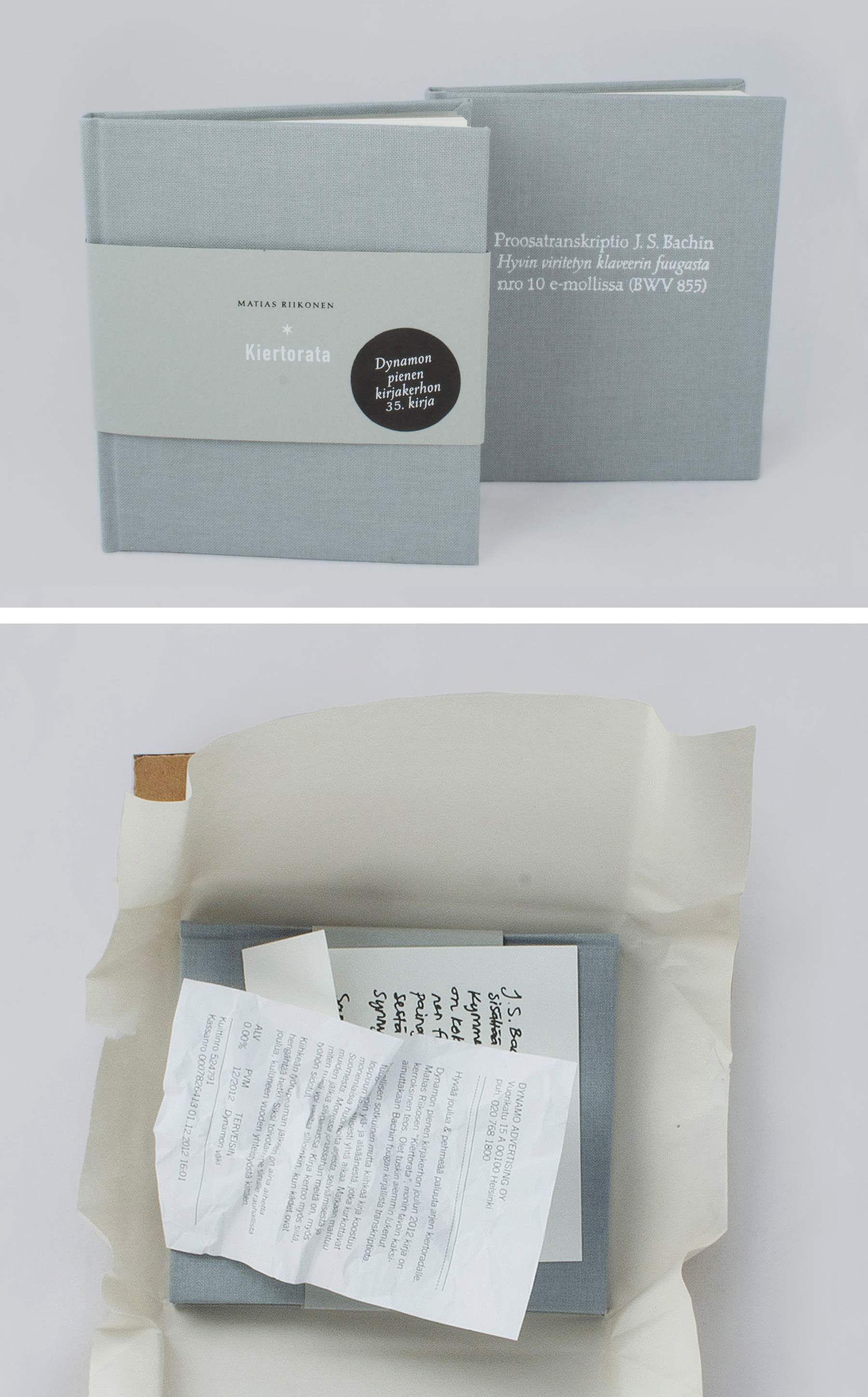 Pienen suomalaisen kirjakerhon, eli mainostoimisto Dynamon joulukirja oli viime jouluna Matias Riikosen Kiertorata. Sen kahteen tasoon kirjoitettu muoto ja sisältö oli saanut vaikutteita J.S. Bachin Hyvin viritetyn klaveerin fuugasta nro 10, e-mollista. Suunnittelimme sen pakkauksineen yhdessä Sini Gummeruksen kanssa ja lopputulosta kiittelivät ainakin asiakkaat.