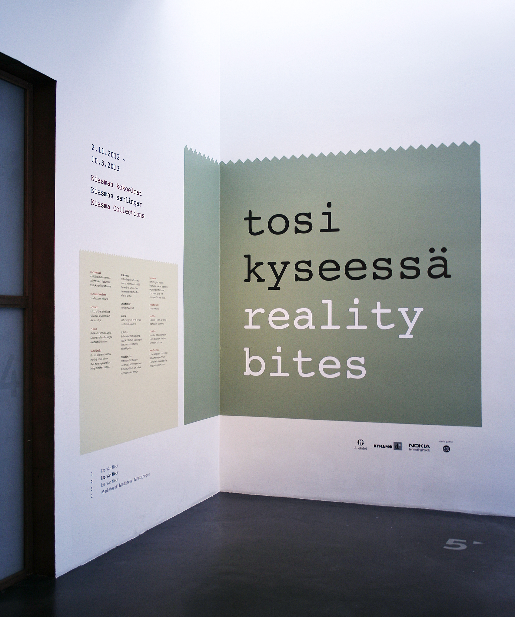 Kiasman uuden Tosi kyseessä/Reality bites -näyttelyn ilmeen suunnittelu oli unelmatoimeksianto. Pohdimme yhdessä tiimin kanssa kuinka ilme taipuu mainontaan, näyttelygrafiikkaan, verkkoon, julisteisiin ja niihin isoihin lakanoihin Kiasman seinillä. Kiasman omat graafikot sovelsivat suunnittelemaani ilmettä näin upeasti näyttelytilojen seinillä.