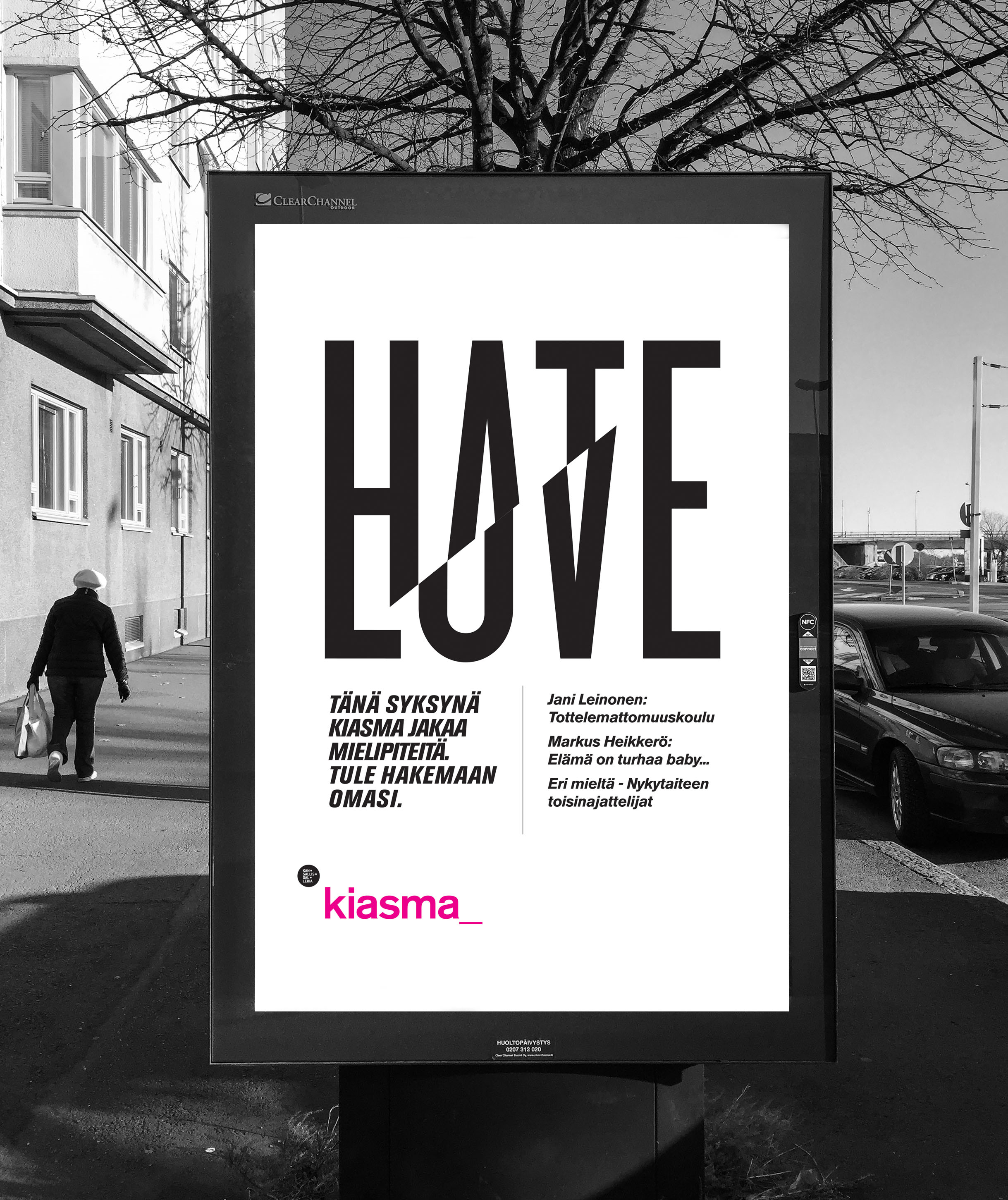 Tänä syksynä Kiasma jakaa mielipiteitä Jani Leinosen, Markus Heikkerön ja Eri mieltä -näyttelyiden avulla. Suunnittelimme täällä toimistolla yhdessä Pasi Janhusen kanssa tällaisen näyttelyitä yhdistävän teeman, joka jalkautui juliteformaatissa kaupungin kaduille. palautteen perusteella se on huomattu erittäin hyvin, eli edelleenkin kaikki ne vanhat lainalaisuudet joista julistesuunnittelun yhteydessä puhutaan, pitävät paikkansa. Yksinkertainen oivallus ja toteutus ovat aina kauneinta katseltavaa.