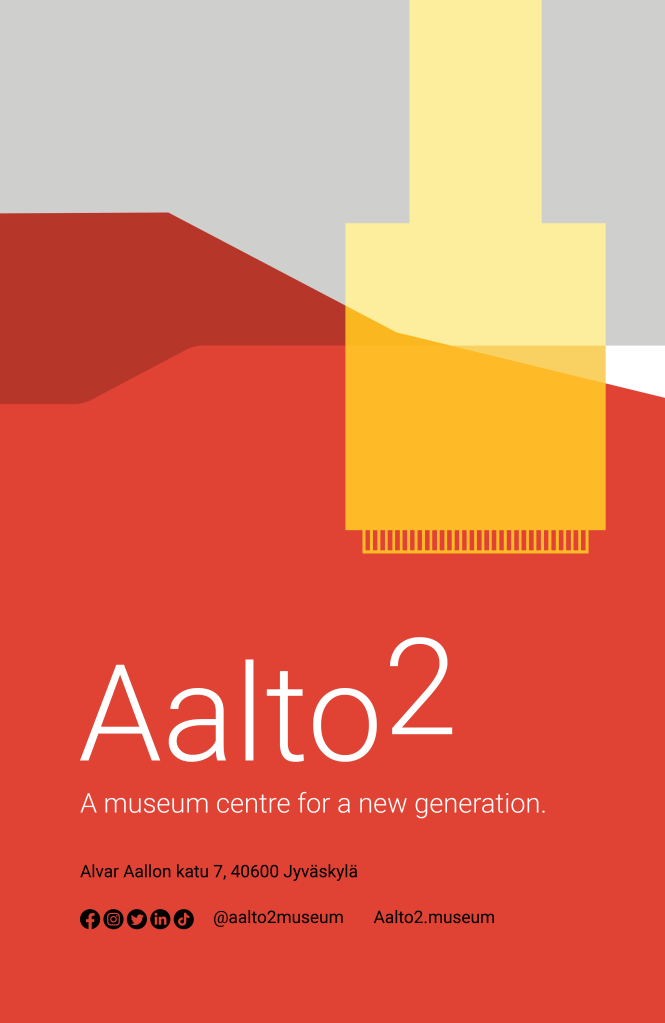 Keski-Suomen museo ja Alvar Aalto museo yhdistyivät Aalto2 museoksi. Minulla oli suuri ilo ja kunnia suunnitella kokonaisvaltaisesti uusi ilme; logo, typografia, värit, kuvat, opasteet, someilme ja verkkosivu.