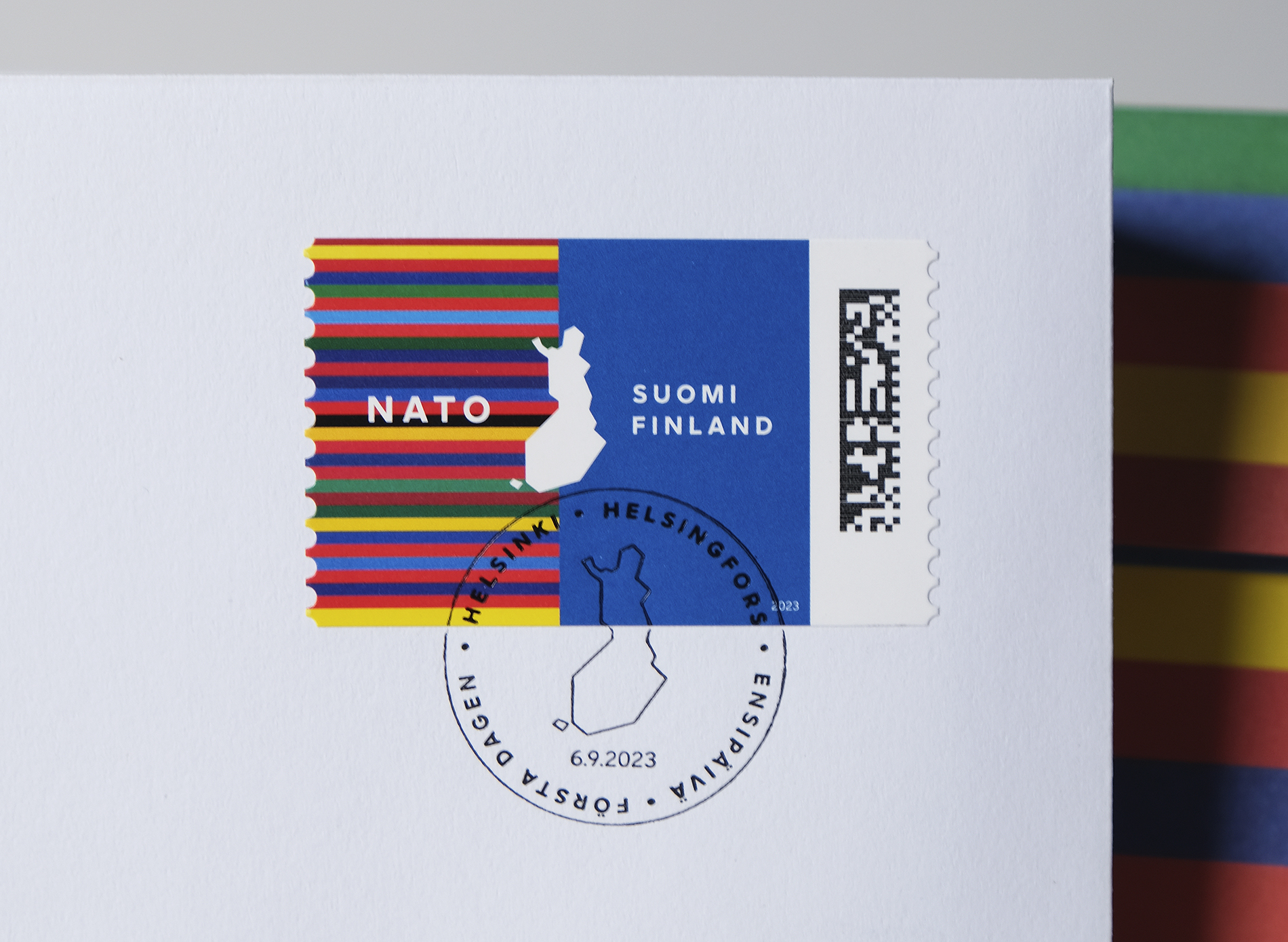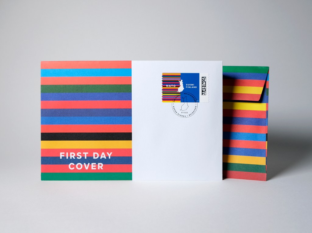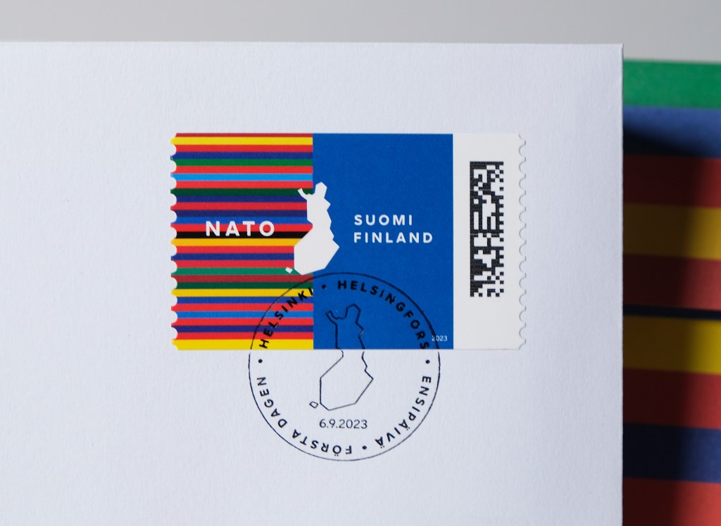 Posti Group published a historical stamp in honor of Finland joining NATO. It tells a story about our strong, independent position among member states. One color from the flag of each of the 31 member countries has been selected for the stamps color striping, to symbolize diversity, the power of community and solidarity. The role of the blue color of the Finnish flag is still strong and the map of Finland is positioned in the middle of the Finnish flag and the flag colors of the member countries.